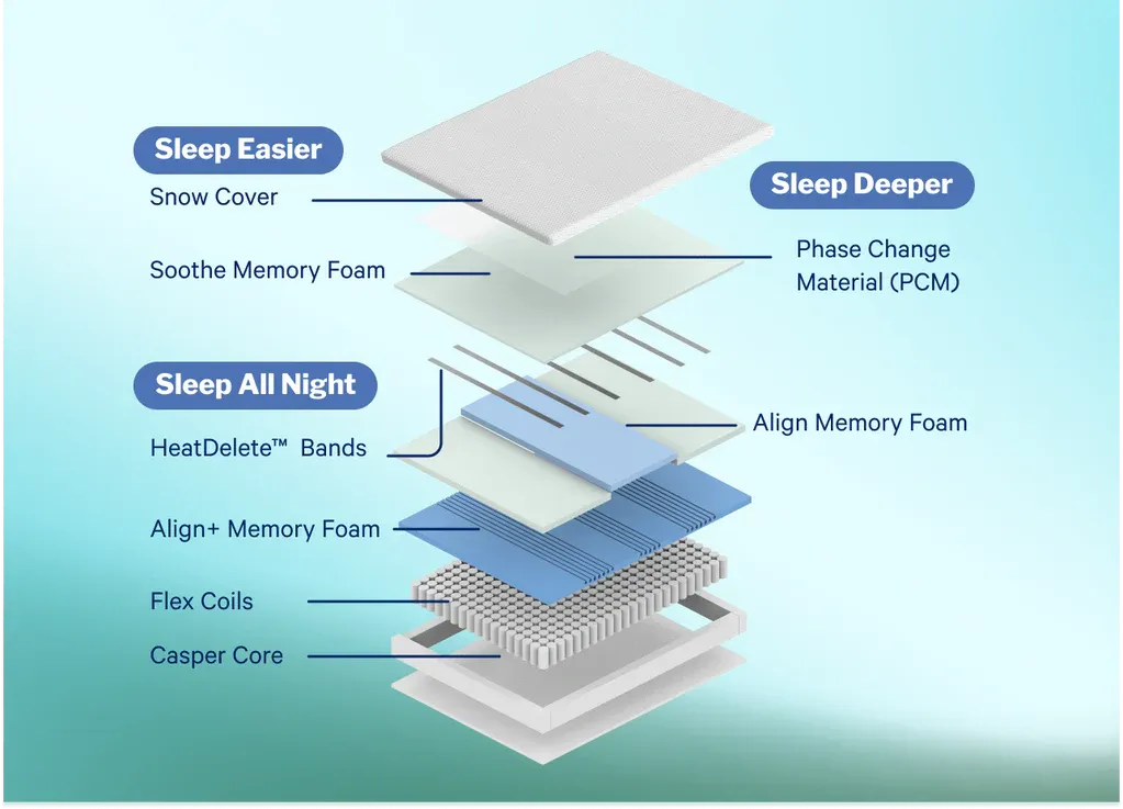 The Casper Snow Max Hybrid enhances comfort and cooling with a multi-layer system designed for airflow and support: